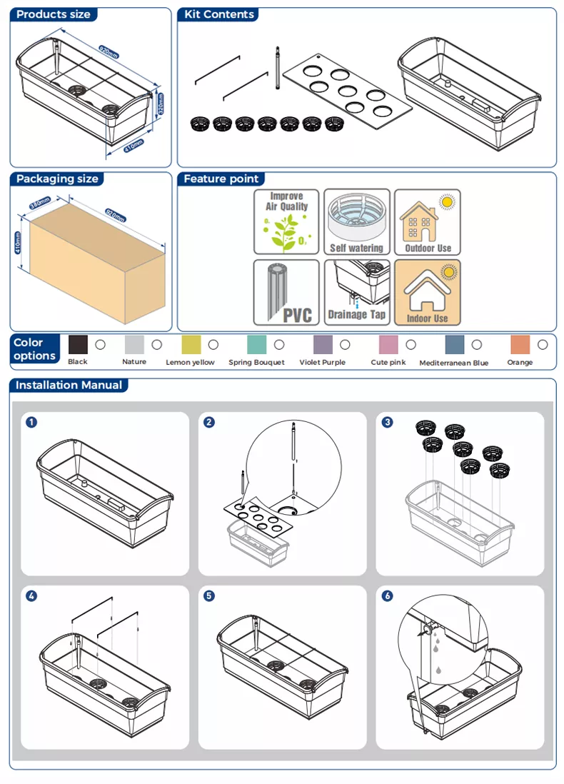 Esta cepilladora de riego automático de 30 litros es adecuada para cultivar hortalizas, plantas verdes y flores. Está equipado con un indicador de nivel de agua para controlar el nivel del agua. Cuando el nivel del agua excede el valor máximo, es necesario drenar el agua de la olla. Hay una válvula de drenaje en el costado de la olla. Empújelo hacia adentro para cerrarlo y jálelo hacia afuera para drenar el agua. Esta maceta se puede utilizar tanto en interior como en exterior. Al usarlo en exteriores, asegúrate de abrir la válvula de drenaje para evitar que se acumule agua en la maceta debido a la lluvia.