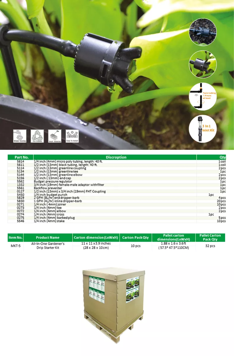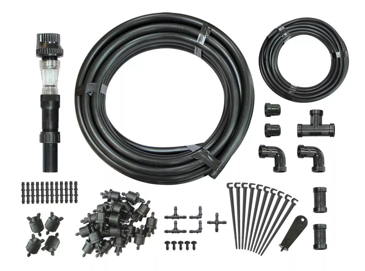 El kit de inicio por goteo para jardineros todo en uno le ayuda a construir su propio sistema de riego. Los kits de riego por goteo son una solución eficiente y que ahorra agua para las necesidades agrícolas, hortícolas y de jardinería doméstica. Entregan agua directamente a las raíces de las plantas, minimizando el desperdicio y maximizando la salud de las plantas.
