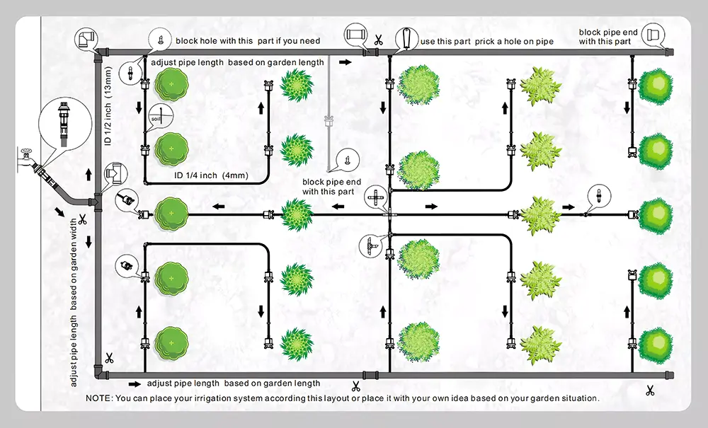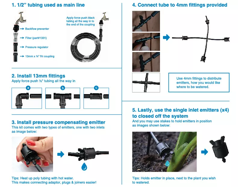 Fácil instalación: diseñado para configuración de bricolaje con tubos, emisores y conectores flexibles.