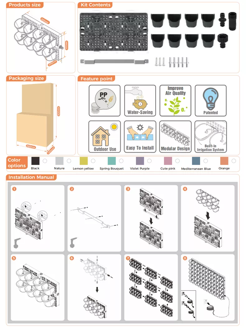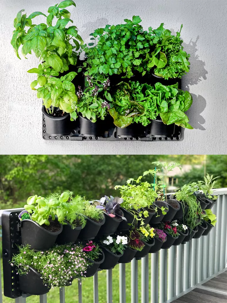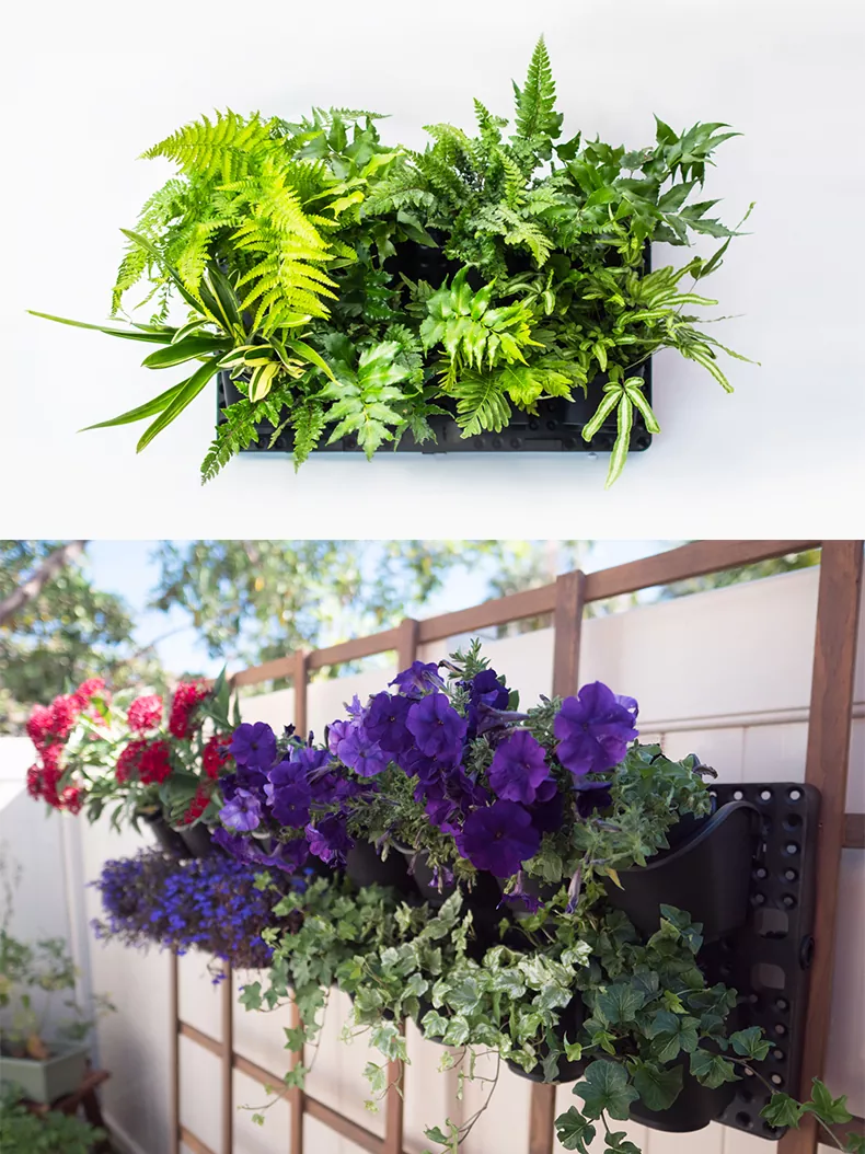 Este muro verde es ideal para jardinería en espacios pequeños y cada panel viene con ocho macetas pequeñas intercambiables (6,5" de largo x 4,75" de ancho x 5,5" de profundidad) con sistema de riego incorporado.