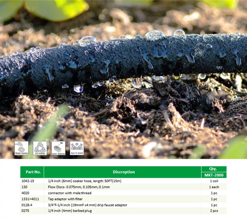 KIT DE INICIO DE MANGUERA DE REMOJO DIY MKT-2000 1, cree fácilmente un riego eficiente y conveniente sistema para tu jardín 2, la manguera de remojo conserva hasta un 70% más de agua, ahorrando su dinero y ayudar a sostener nuestros recursos naturales 3. Contiene todo lo que necesitas para configurar un riego con manguera de remojo. sistema