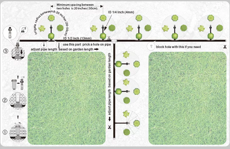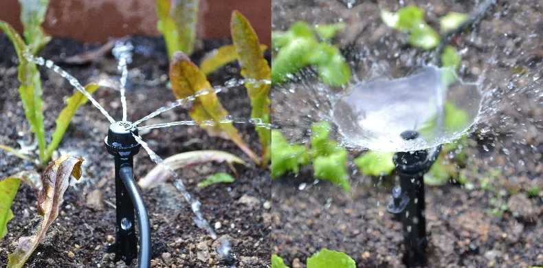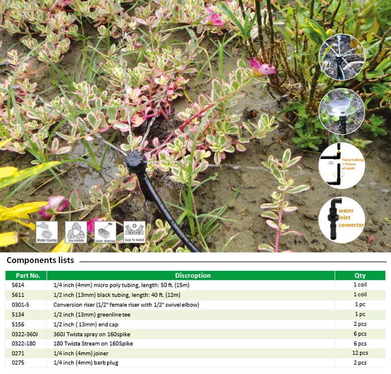 Este kit fácil de instalar es perfecto para principiantes, ideal para regar huertos, macizos de flores y césped. El juego incluye dos boquillas pulverizadoras con diferentes patrones de pulverización: